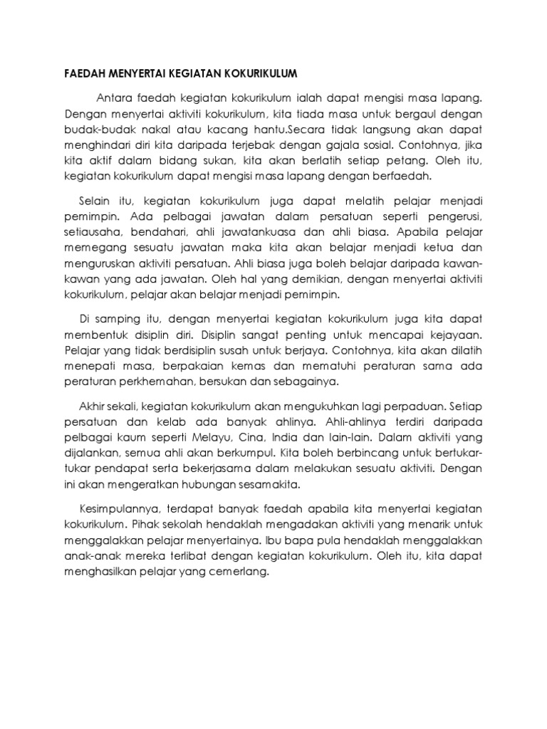 Karangan tentang faedah menyertai aktiviti kokurikulum di sekolah. By Wu - August 27 2018 Anak-anak yang masih muda khususnya mereka yang masih berada di bangku sekolah merupakan harapan bangsa dan negara pada masa hadapan untuk mengemudi kecemerlangan bangsa dan negara di pentas global kerana. Pada pendapat anda apakah kepentingan menyertai kokurikulum dan nyatakan strategi-strategi terbaik untuk menarik minat pelajar untuk menyertai kegiatan kokurikulum. Hal ini amat membimbangkan kerana usaha untuk melahirkan modal insan yang holistik dan seimbang tidak dapat dicapai melalui bidang kurikulum sahaja tanpa penglibatan aktif dalam aktiviti kokurikulum.