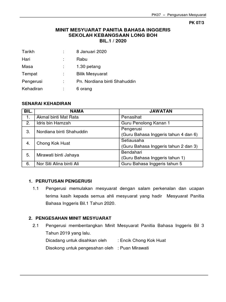 Minit Mesyuarat Bahasa Inggeris Kali 1 2020 Pdf