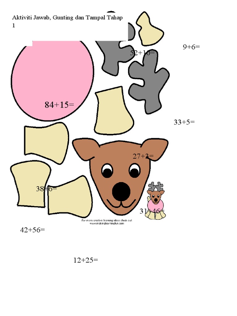 Minta anak gunting kertas warna mengikut lakaran. Menyatukan kepingan-kepingan gambar menjadi gambar yang lengkap akan membantu mengembangkan cara berfikir anak-anak. Labelkan nama haiwan untuk anak buat rujukan.