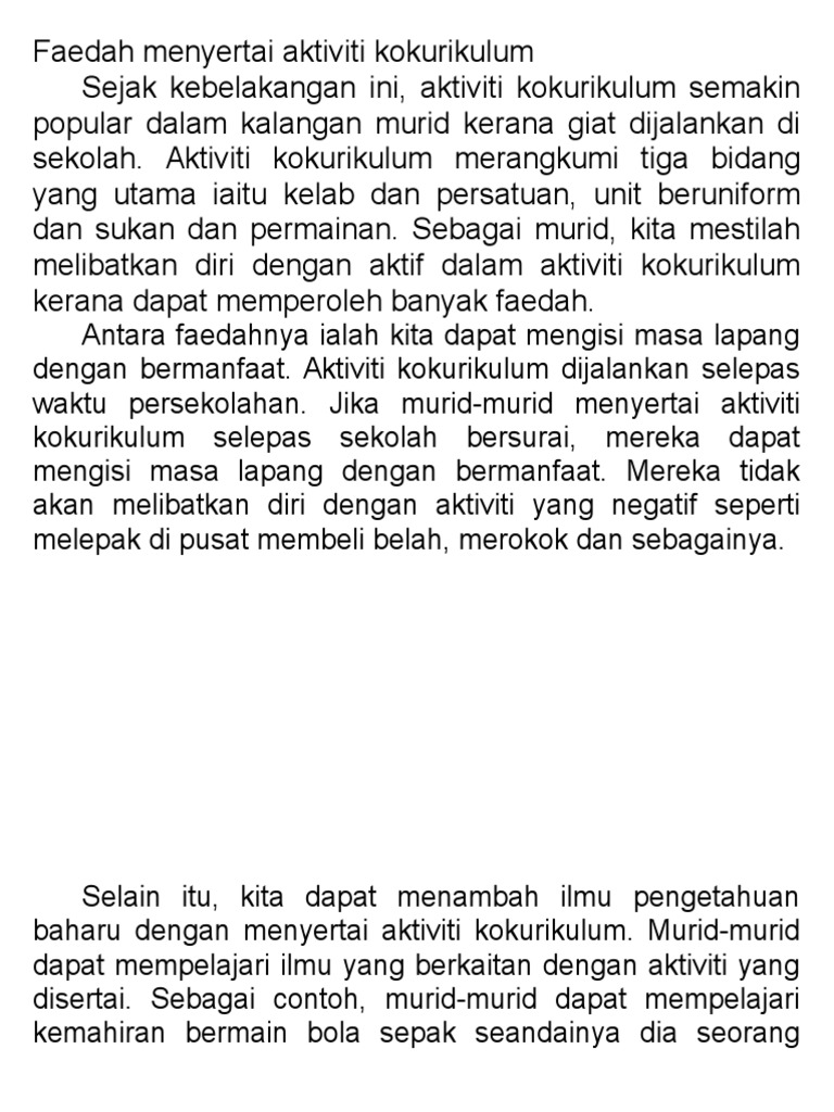 Contoh Karangan PT3 Kebaikan Menyertai Aktiviti Kokurikulum Aktiviti kokurikulum merupakan satu daripada elemen yang terdapat dalam pendidikan di sekolah. 90 90 found this document useful Mark this document as useful. Kebiasaannya aktiviti kokurikulum diadakan pada sebelah petang atau hujung minggu.
