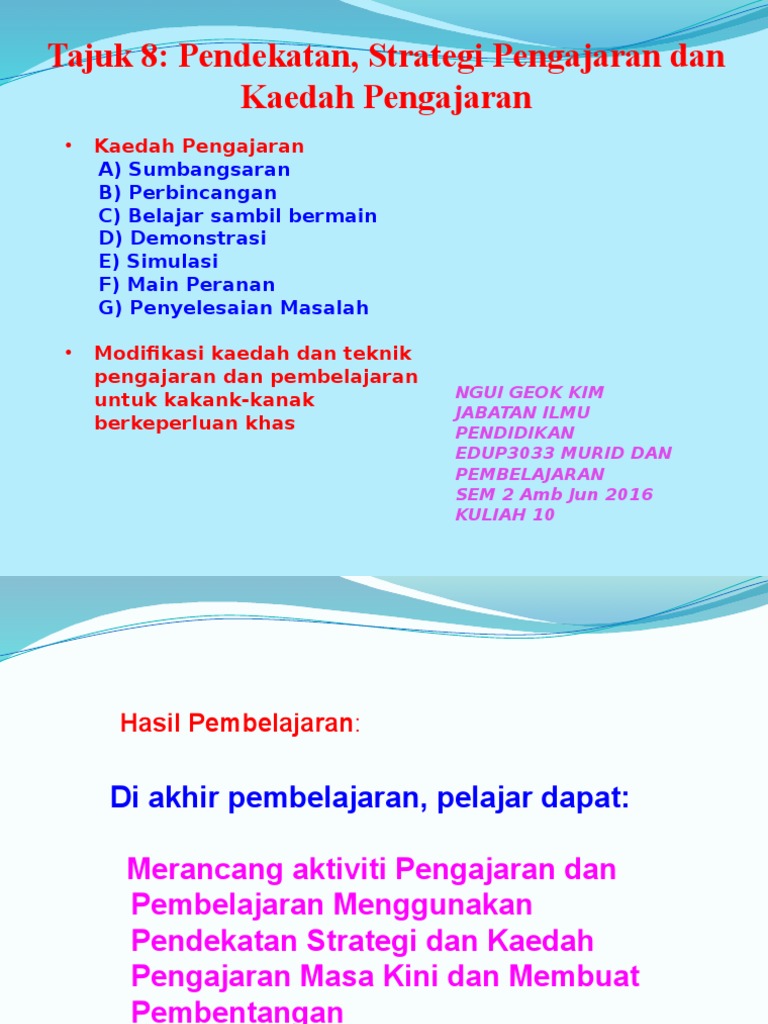 Pengajaran dan pembelajaran dalam bilik darjah yang telah dikenalpasti dalam kajian ini. Pemilihan strategi teknik dan aktiviti pengajaran yang baik dapat membina kefahaman pelajar terhadap pelajaran di bilik darjah serta dapat memastikan aktiviti pengajaran dan pembelajaran berjalan lancar sistematik menarik dan menyeronokkan pelajar seterusnya memudahkan pelajar memahami isi pelajarannya. Noor Hisham Md Nawi Pusat Pengajian Bahasa Pembangunan Insaniah Universiti Malaysia Kelantan Abstrak Pendekatan dan kaedah pengajaran dan pembelajaran.