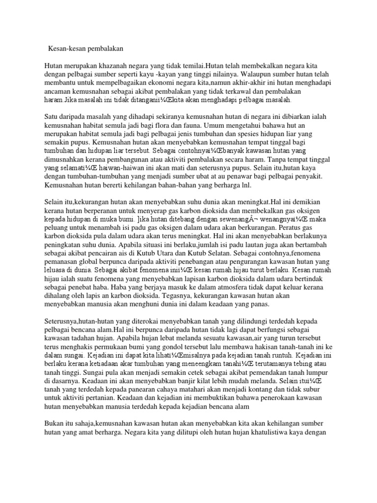 Entri ini hanya sebagai bimbingan untuk membantu kalian menulis. Penebangan hutan daripada aktiviti pembalakn menyebabkan peningkatan suhuHal ini disebabkan ketiadaan pelindung yang menghalang bahangan matahari dan lebihan gas karbon dioksida dalam atmosferaContohnya pengurangan kelembapan udara akan membebaskan wap-wap air ke udara. Umum mengetahui bahawa hutan merupakan tempat tinggal semula jadi bagi pelbagai jenis tumbuhan dan spesies haiwan liar.